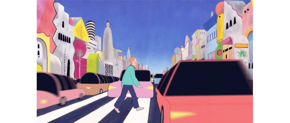 Dans cette véritable jungle urbaine aux couleurs tropicales, on croirait bien voir se dresser des palmiers et des fleurs exotiques imbriqués dans les façades qui, en plus pastel, rappellent les machines de Fernand Léger. Arthur Sevestre convoque ici une animation un peu fabuleuse mise au service de l’ambiance à la fois radieuse et oppressante de sa cité fourmillante. Soudain, une bousculade. Un regard, une étincelle, un peu de considération sincère. Un temps comme suspendu dans cet échange bref entre deux âmes et pourtant plus que signifiant. Ce n’est plus dès lors le grondement citadin qui résonne à nos oreilles, mais bien le cœur du jeune homme, qui dans le sursaut du coup de foudre et après quelques hésitations, se lance à sa poursuite de son bienfaiteur. Ce petit voyage bigarré au cœur de masses humaines cette fois statiques, dont l’élan romantique et enflammé compose une sorte de Où est Charlie grandeur nature, alterne les perspectives et les champs de vision autour d’un personnage devenu acteur de sa propre fortune, qui ne subit plus le mouvement de ses pairs. Il est de ces rêveurs, de ces penseurs exaltés qui savent encore y croire.