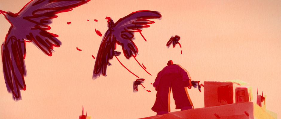 Pour les premiers cités, on verra – dans l’ordre alphabétique – Carcassonne-Acapulco de Marjorie Caup et Olivier Héraud, le déjà célèbre La fille qui explose de Caroline Poggi et Jonathan Vinel, La vie avec un idiot du tout aussi (et même plus !) illustre Theodore Ushev (produit par Miyu), l’écran-d’épinglé Les bottes de la nuit de Pierre-Luc Granjon, l’horrifique Quai Sisowath du duo Stéphanie Lansaque/François Leroy et une animation de volumes, Sulaimani de Vinnie Ann Bose (visuel ci-dessous).