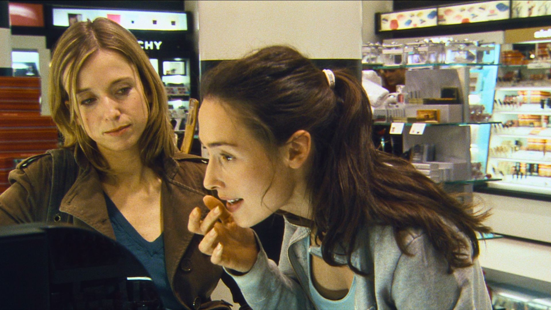 Un plan-séquence, deux actrices repérées, une prééminence du dialogue et une chute. Dans le sens de “film à chute”, bien sûr, cette catégorie inaltérable du court métrage, surtout sur des durées aussi courtes (cinq minutes, chrono en main). Le synopsis annonce que “dans un magasin, deux filles ont une discussion de filles.” On est alors en 2006 et heureusement, le film est signé d’une réalisatrice ; la description n’est donc pas suspecte d’accents sexistes. Admettons. L’originalité du film est en fait surtout de désamorcer le cliché attendu, car on apprend très vite, après moins d’une minute de récit, que les deux copines ne parlent pas de leurs mecs, mais de leurs pères respectifs ! Des figures envers qui elles rivalisent de rancœurs, de reproches et de sarcasmes. Des cadeaux mal choisis, une absence de communication, la présence de maîtresses qui irrite, etc.
